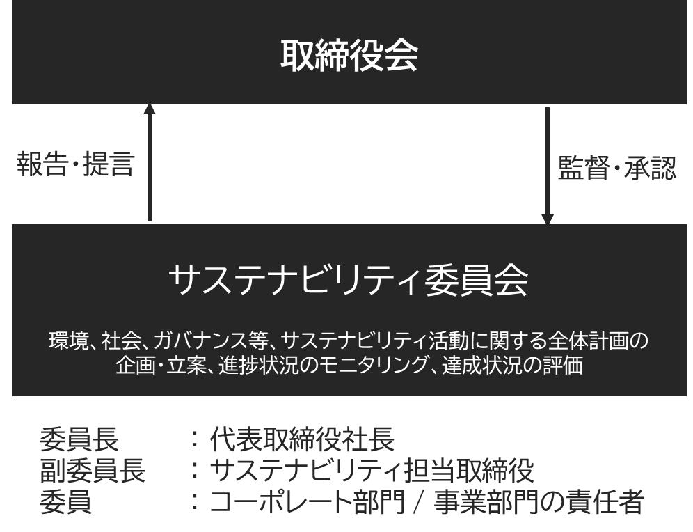 アドソル日進は、代表取締役社長を委員長とする「サステナビリティ委員会」を設置し、サステナビリティに関する取組み・開示を推進しています。 サステナビリティ委員会は、アドソル日進グループ全体のサステナビリティ活動に関する全体計画の企画・立案、進捗状況のモニタリング、達成状況の評価を行っています。また、定期的に取締役会に報告・提言を行っています。