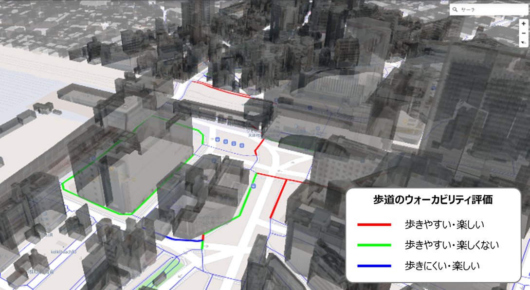 慶應義塾大学 SFC研究所 厳網林研究室との研究開発の一環として、東京都の「地域を主体とするスマート東京先進事例創出事業」の令和6年度支援プロジェクトに選定された「デジタルエリアデザインの共創 in 大井町」に参画しています。ウォーカビリティ(歩きやすさと歩く楽しさを評価する指標)に着目。GIS:地理情報システムとIoT技術を活用し未来型まちづくりに必要な情報をデジタル化する「スマートシティ支援プラットフォーム」の開発を担っています