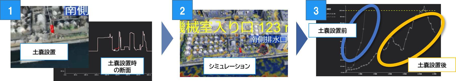 浸水時における、土のう設置と効果検証シミュレーションから、浸水被害対策に活用いただけます。