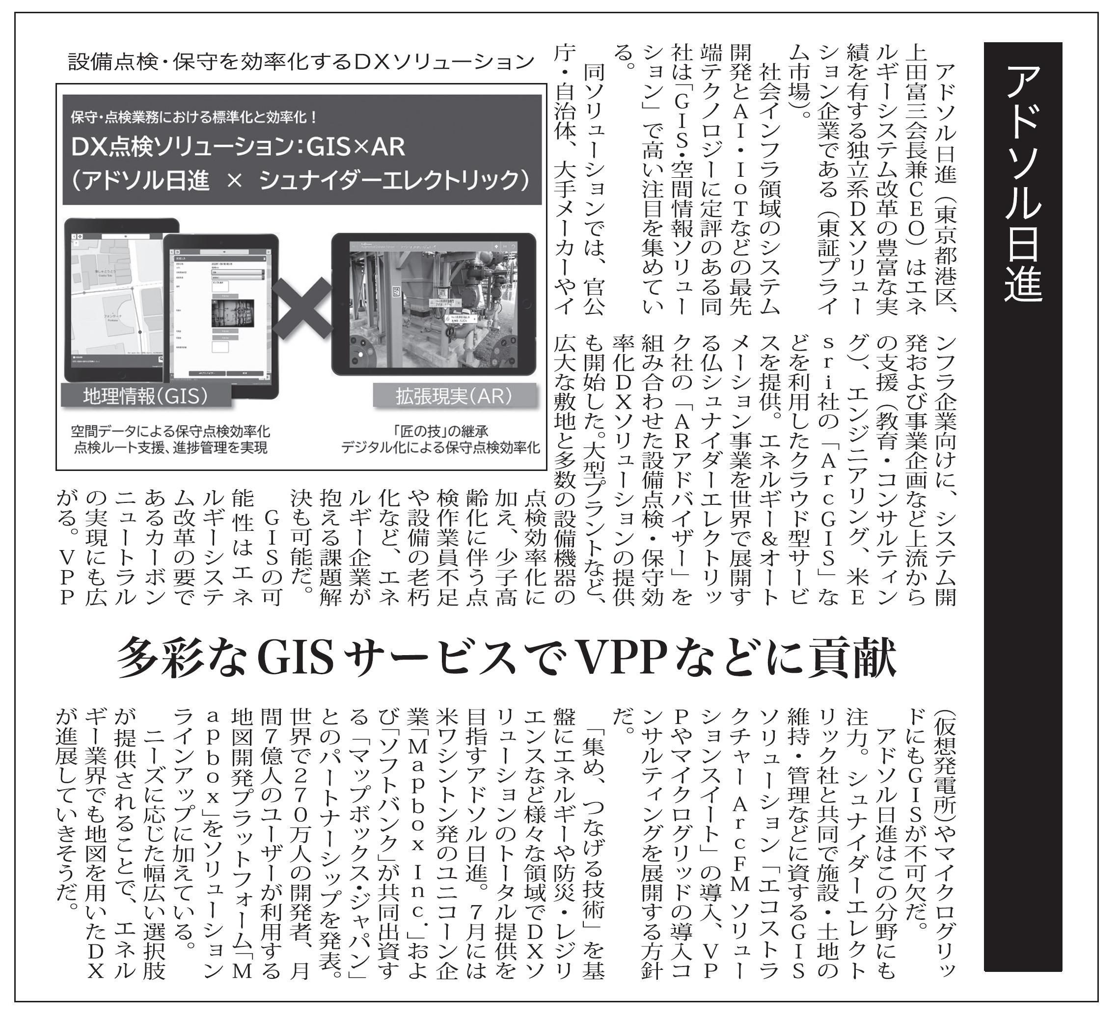 2022年8月30日(火) 電気新聞の「GIS(地理情報システム)特集」に、当社の「GIS・空間情報ソリューション」に関する取り組みが掲載されました。